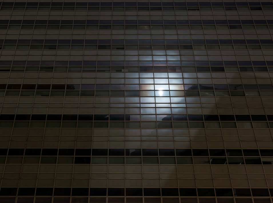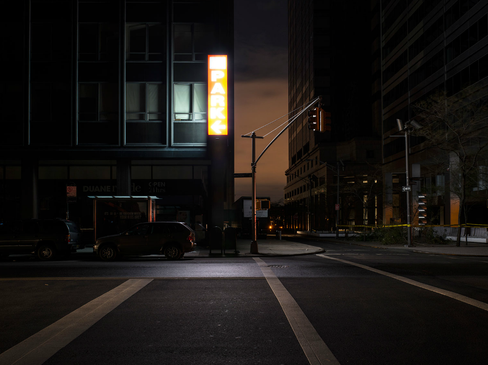 “It was so dark you could not see without a flashlight in many of the darkest streets,” he notes. “Looking up, the buildings appeared like dark canyon walls and stars were visible for a rare and brief time.” An architect before discovering photography, Fradkin knew that these buildings were designed with light in mind. To photograph them without their usual brilliance was perhaps to capture a truer face. “The architecture of Lower Manhattan… was totally mute, deadened, and monolithic . . . rendered obsolete by a force much greater than the collective power of our species.”