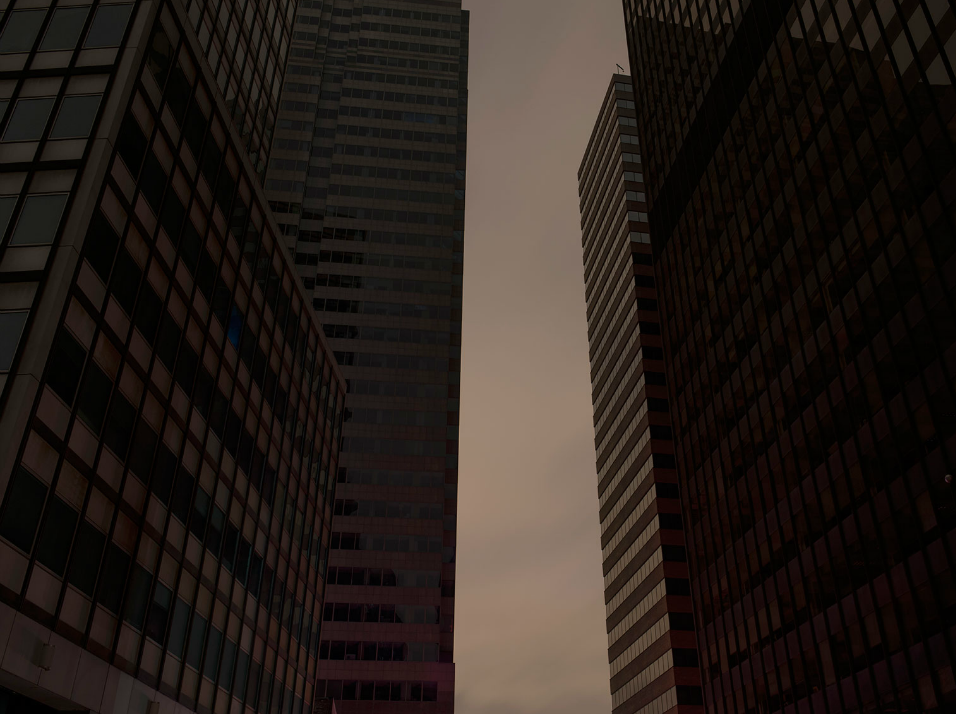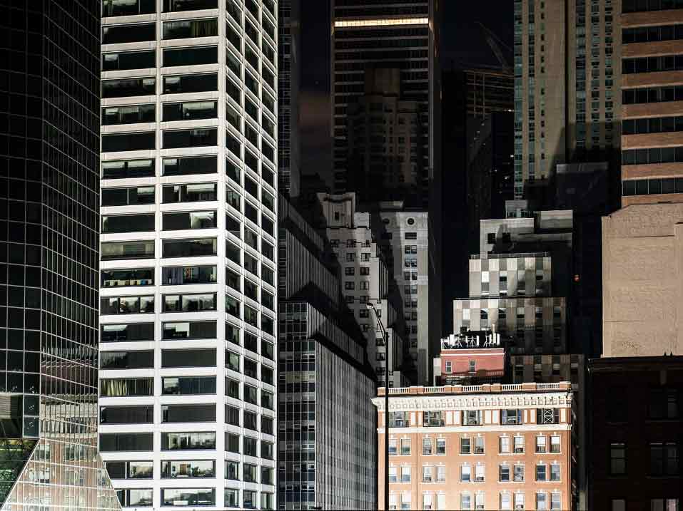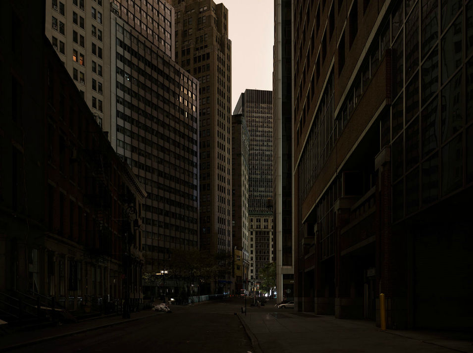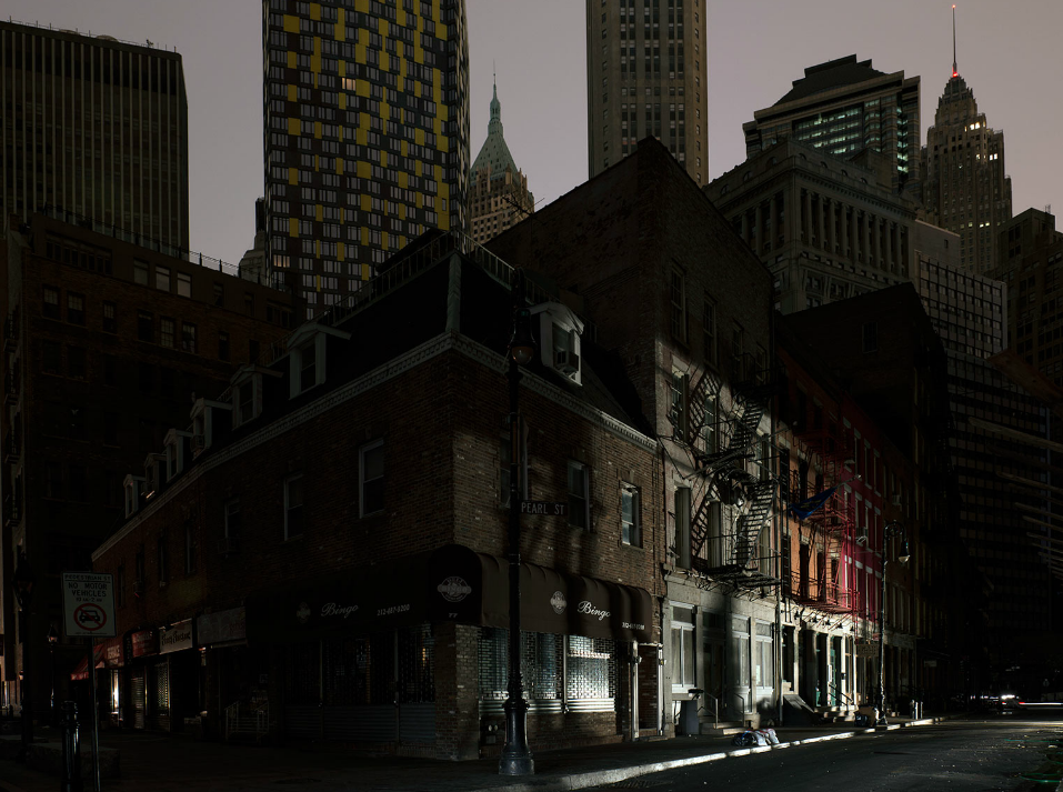 I photographed for four nights in Lower Manhattan and wandered every street in the pitch black. It was so dark you could not see without a flashlight in many of the darkest streets. Looking up, the buildings appeared like dark canyon walls and stars were visible for a rare and brief time. The architecture of Lower Manhattan, usually brightly illuminated from inside and out and full of life, was totally mute, deadened, and monolithic. Architecture and its function for which it was intended was rendered obsolete by a force much greater than the collective power of our species and unchecked hubris.