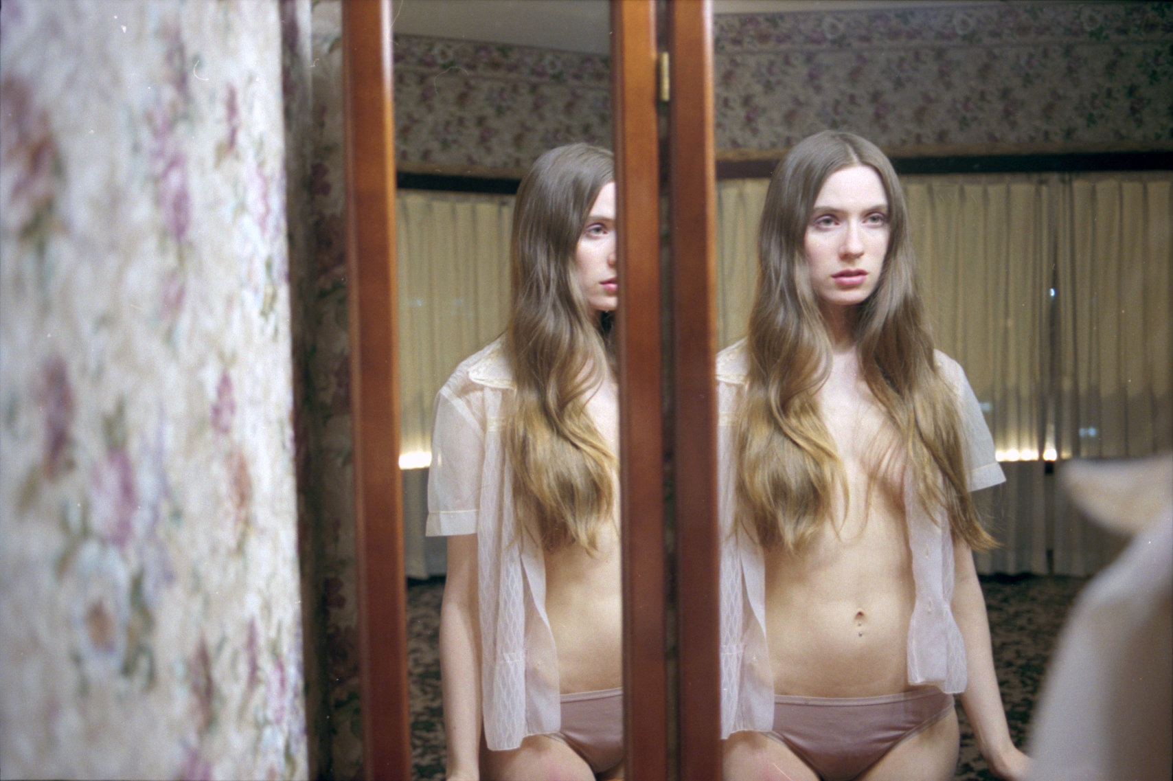 There are three people in the above photograph, and it would also be true to say that there are none. What starts as a familiar scene—a young beautiful woman staring into her reflection—has been complicated. Questions peek out. You begin to wonder why her unreflected body is obscured. Who exactly is she hiding? The photograph no longer looks like a self-portrait but one taken by a friend or a partner in a quiet hurry.