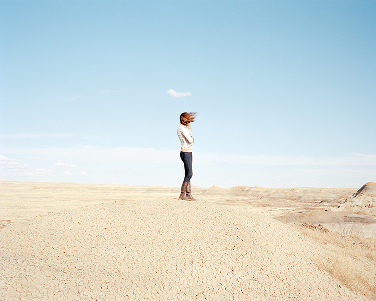 We were driving on a particularly empty stretch of highway when we passed a turn off to the right called Crow Rock Road. Something about it caused me to double back. We drove down the road a few minutes before getting out to climb a hill. The landscape was very affecting and I had a good feeling about making a nice image. I asked my girlfriend to stand on the top and the wind gusted unexpectedly.