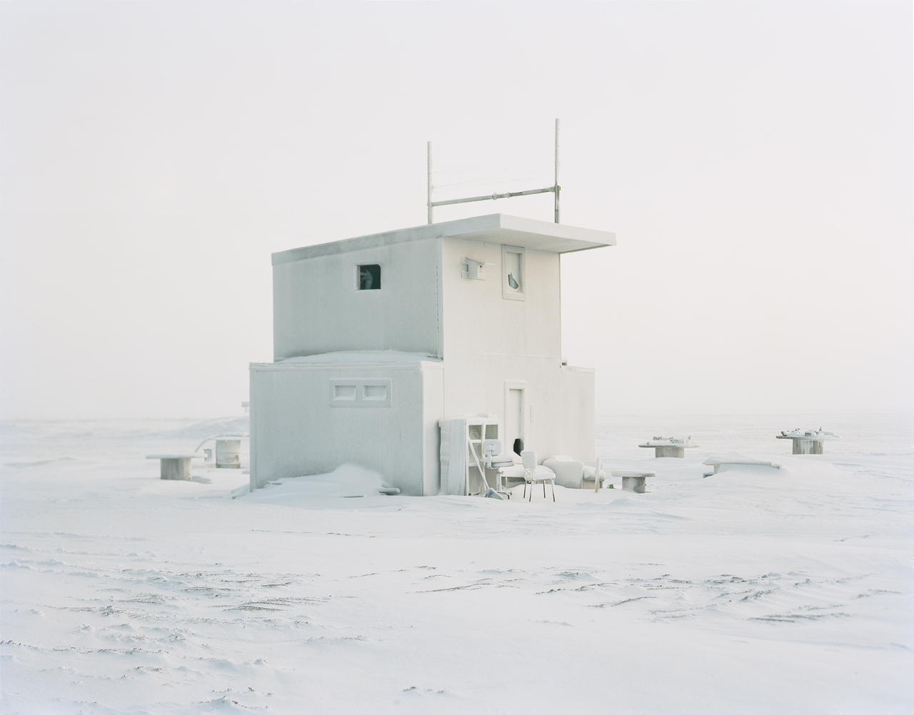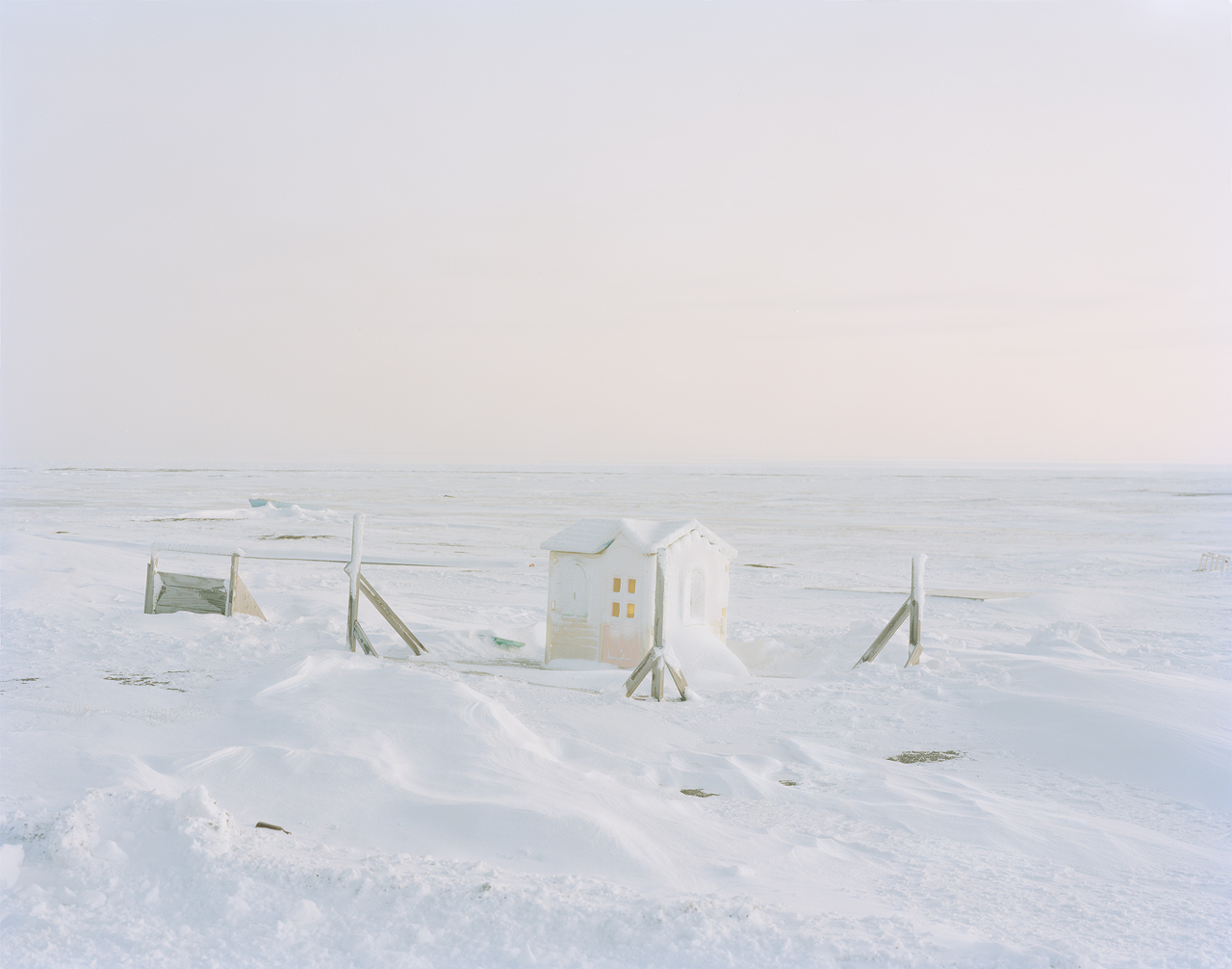 I first began work on my project “Barrow Cabins” while on a separate editorial assignment in Barrow in the summer of 2010. I would photograph for the assignment during the day, then head out in the midnight and early morning hours of the arctic summer to photograph. The cabins are situated along the shores of the Chukchi Sea, part of the larger Arctic Ocean. In December 2012, I returned to photograph the cabins during the frigid grip of the Arctic Winter Solstice, when a brief four-hour window of dusk-like light illuminates the otherwise lightless days. The resulting winter images act as a sort of luminous erasure of the photographs made during the summer. Seen together, both the summer and winter series are a meditation on the passage of time and seasonal shift along the extreme horizon of the Arctic.