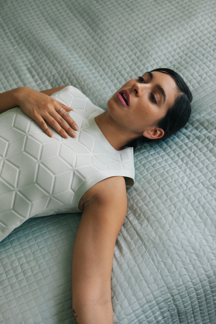 As if from another time, the seemingly matched colors and fabric, the tattoo barely there. She holds the opposite of her heart, relaxed but thinking. She’ll tell someone — much later — that it was in her favorite days that she met two lovers at the same time. She had to decide. She couldn’t.