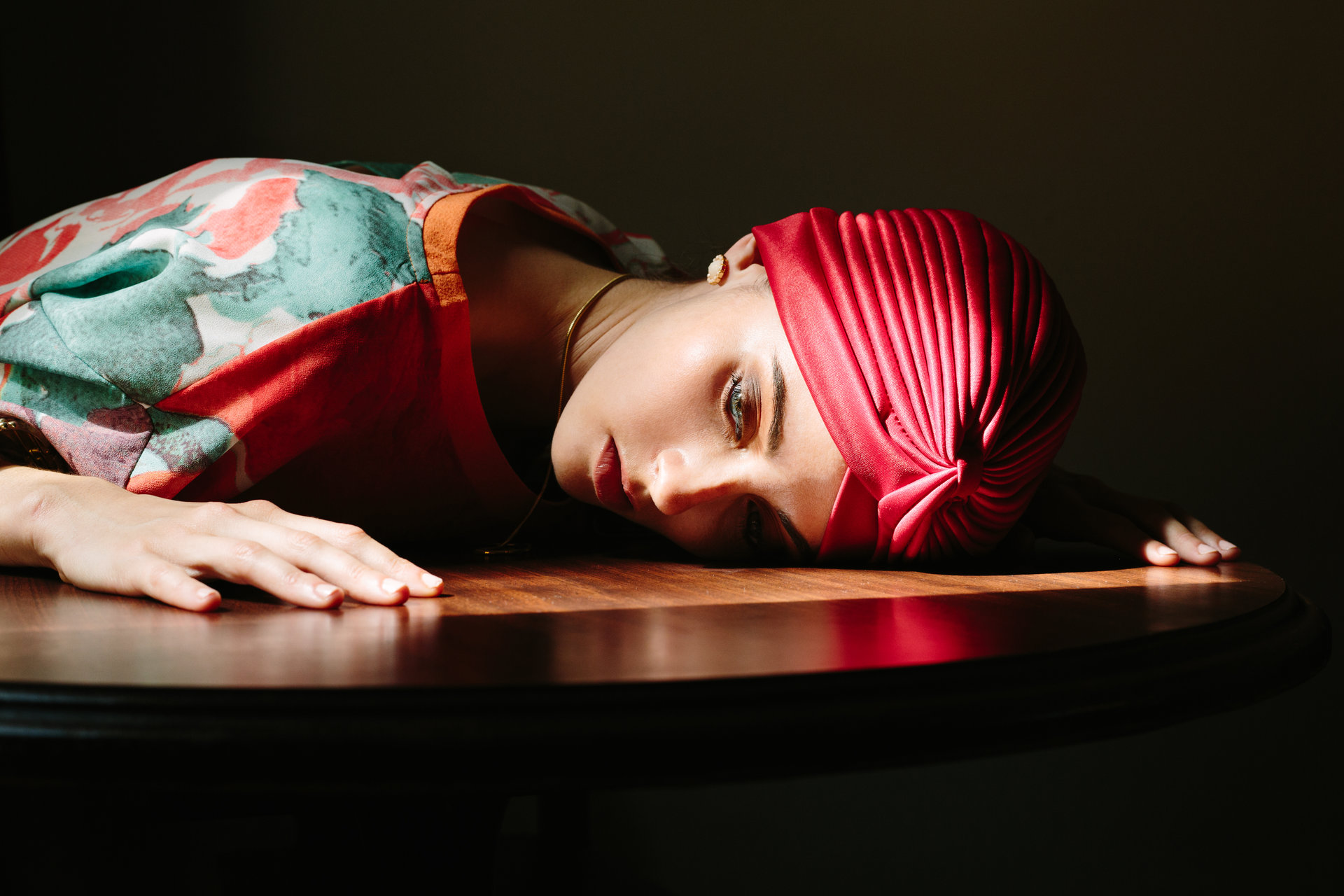 Ohhh, I love this image and you’re going to love this: it’s only window light. I used a Canon 5D Mark 3 and a 50mm lens. I remember in college studying Art History how the great masters would paint by window light, so when I walked into this location and saw this window in the dark backside of a hotel room, with the curtains drawn except for 4 inches spilling a line of light across the table and the floor, and after having the stylist bring in the model wearing a turban, which was the piece to be highlighted in the image, I instantly knew she had to be sitting down with her cheek on the table with the turban in the beam of light. The concept for the piece is “Letters from Home”, and it is a fashion-editorial embodiment of the 70s. It’s about a girl who’s waiting for news of her love who was sent off to Vietnam. I shared that idea with the model and asked her to embody what that would feel like, and I think she pulled it off.