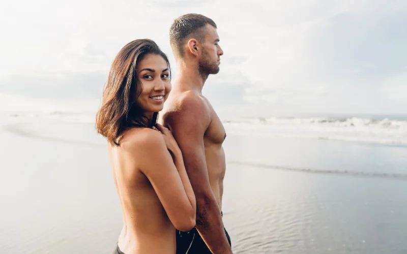 For a fun nude couple photoshoot, you can suggest ideas like tickling, jumping, or playfully splashing in the water to capture the joyous moments. This type of couple nude pose can create a sense of joy and playfulness that can be just as beautiful and intimate as more serious shots.