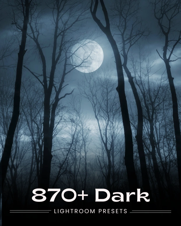 Get 870+ Dark Lightroom Presets for rich shadows, bold contrast, and moody, cinematic edits that are perfect for dramatic visuals.